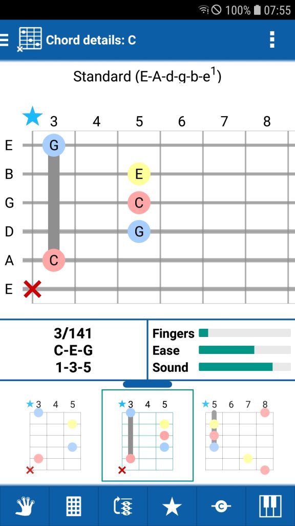 The overview screen gives you an overview of the different ways to play a chord. You can use the pinch gesture to make the chord diagrams smaller or bigger.