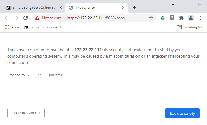 If you can't get a connection, click 'Check connection'. Eventually, your browser asks you to accept smartChords self-signed certificate.